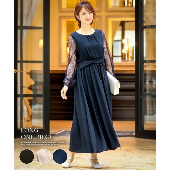 パーティードレス 結婚式 お呼ばれ 披露宴 ドレス ロングワンピース ウエストゴム 袖コンシャス レース袖 リボン ベルト付き ロングドレス パーティー ロング丈 袖あり レース フォーマル ワンピース 膝下 入学式 卒業式 母 M L 入園式 二次会 オケージョン Fashion